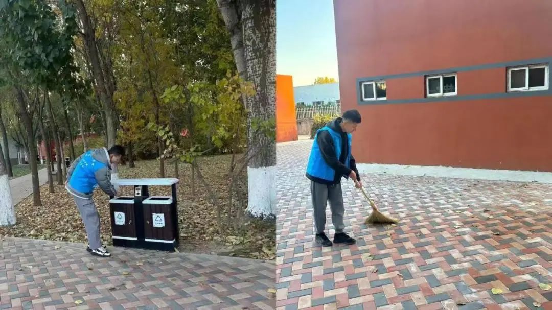 20231114日下午,志愿者们在第二餐厅门口集合。大家齐动手,认真、细心地对校园里的落叶进行集中清扫。