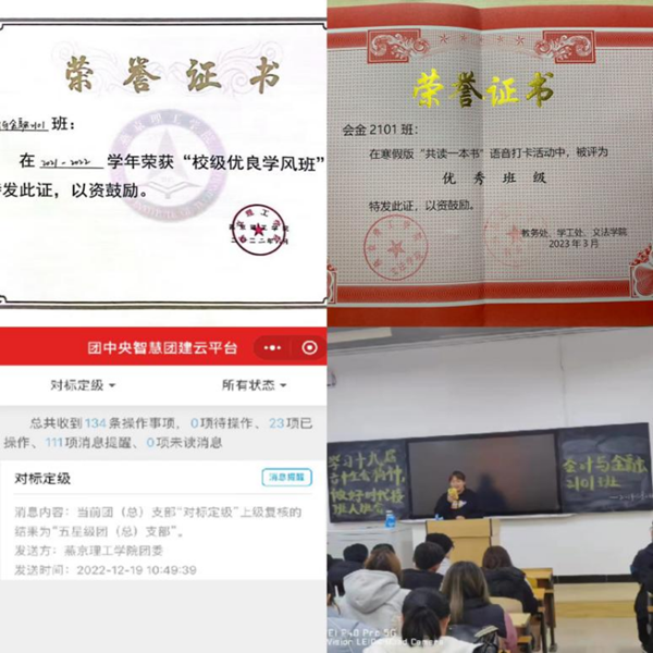 班级曾获2022年度“优良学风班”、“五星级团支部”、连续两年获得英语“共读一本书”优秀打卡班级、2023年度会计学院班级风采大赛二等奖、校级红旗班集体,2024年度等级优秀班集体等荣誉称号。