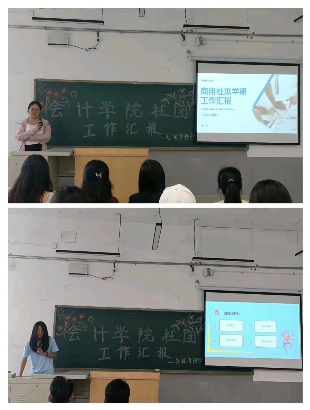 金融证券社、商用社社长也分别对本年度的工作进行了简要概述。他们全面展示了本社团在社团工作上的成就和特色,同时也指出了工作中存在的不足和问题,并提出了改进措施和未来发展规划。