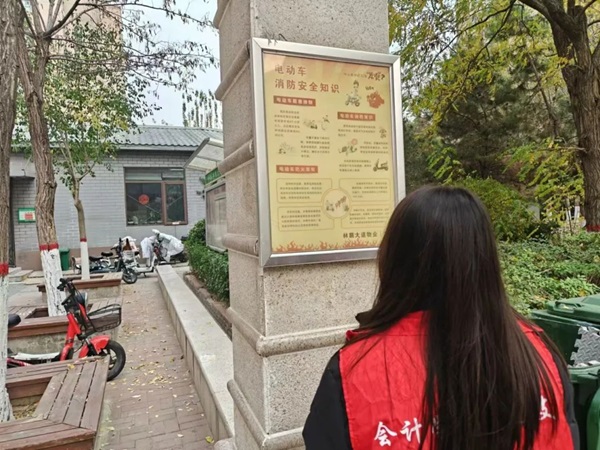 2024年11月9日下午,燕京理工学院会计学院学生志愿者们在校门口集合完毕,一同前往三河市林荫大道社区进行志愿服务活动。在与社区负责人进行对接后,会计学院学生志愿者们被有序分成三组并以认真的态度进行志愿服务活动。一组向居民们进行消防安全宣传,通过讲解火灾发生原因及造成的严重后果,以及如何预防火灾、火灾发生后的逃生技能等知识,提高居民们的安全防范能力,同时并致以亲切的问候和美好的祝福,传递给居民们温暖与关怀。