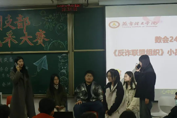 为了提高同学们的反诈意识,数会2401团支部上演一场别开生面的反诈小品,同学们通过生动的表演,将诈骗分子的狡猾和受害者的惊恐无助展现的淋漓尽致。最后自创的《反诈》合唱更是振奋了人心,升华了主题,获得了阵阵掌声。