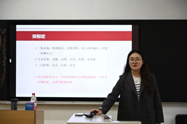 学校心理中心刘丹阳老师对心理健康的基本概念、心理健康标准以及常见心理问题的处理方法等进行了详细讲解,涵盖抑郁症、焦虑症、神经症、强迫症等典型案例。刘老师特别强调了心理委员在校园心理健康工作中所肩负的重要职责与使命。作为连接班级同学与学校心理咨询部门的纽带,心理委员需具备敏锐的洞察力,以便及时发现并给予同学们初步的心理支持与帮助。