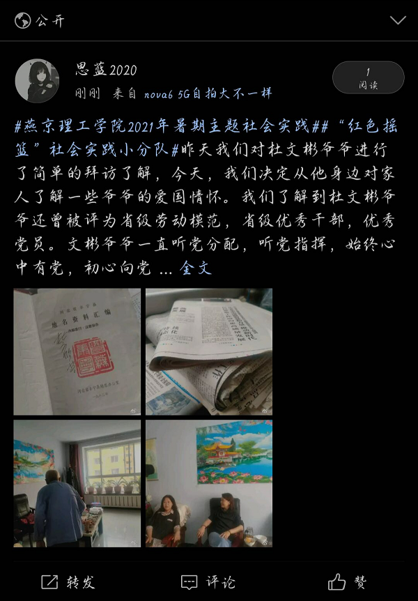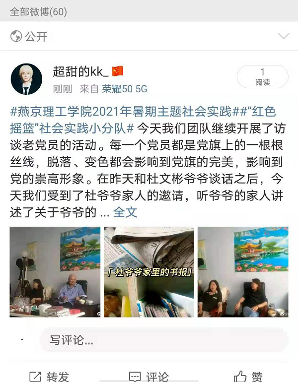 为回顾中国共产党团结带领中国人民不懈奋斗的光辉历程,感悟党领导人民建设祖国的伟大成就和光明前景,在观察实践中学党史、强信念、跟党走,努力成为担当民族复兴大任的时代新人,会计学院红色摇篮社会实践队于834日两天在河北省承德市丰宁满族自治县对老党员杜文彬先生进行访谈。
