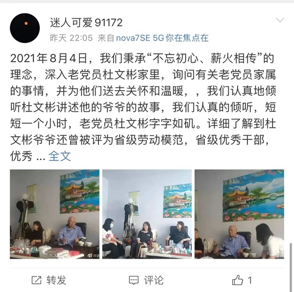 在与杜老先生的交谈中了解到,杜老先生在十六岁加入中国共产党,党龄达70余年,曾任丰宁县平安堡第三区区委书记、张百万公社书记、苏家店公社书记等多个部门的领导干部,在组织部、农村工作队等多个部门工作过。他曾代表县在北京民族文化宫建成初期进行展览参观;在苏家店任职期间为当地百姓自发建成民用电站,这些光辉事迹都成为了杜老先生一生中不可磨灭的痕迹。杜老先生还获得过很多荣誉,曾被评为省级劳动模范,省级优秀干部,优秀共产党员。杜先生的家人们为了支持他的工作也付出了很多,全家随着他的工作变动多次搬家,老先生表示非常感谢他的家人们。