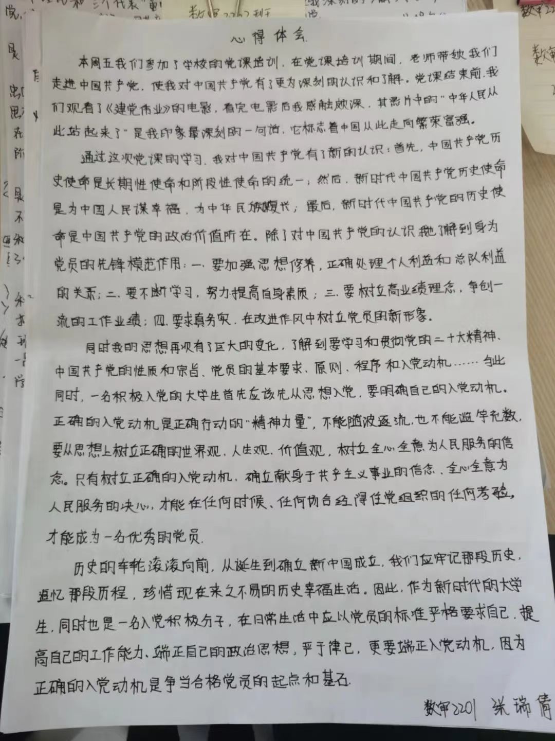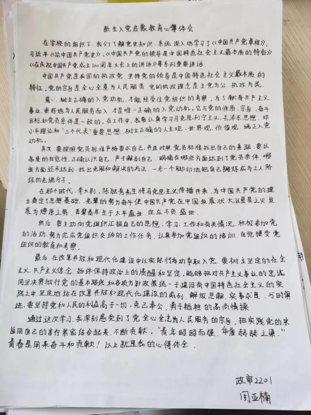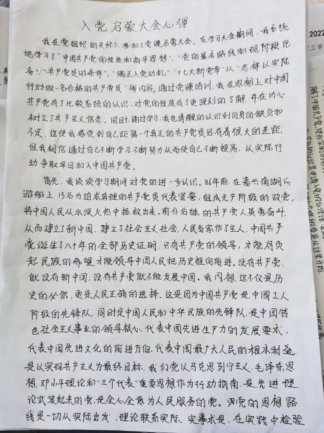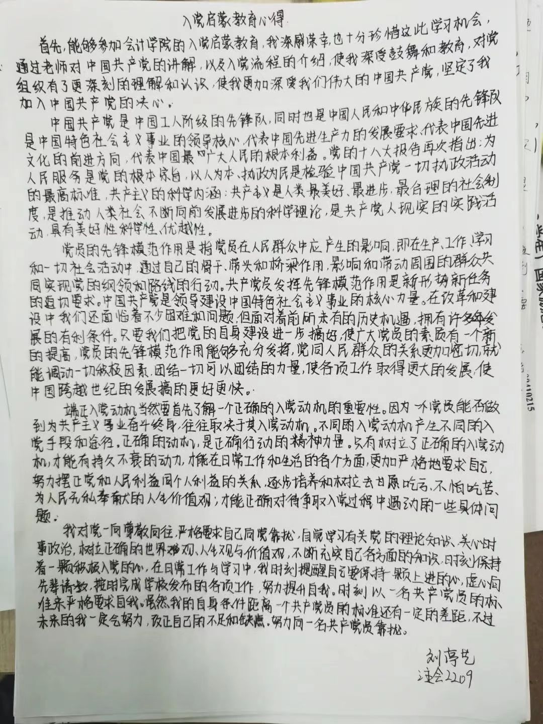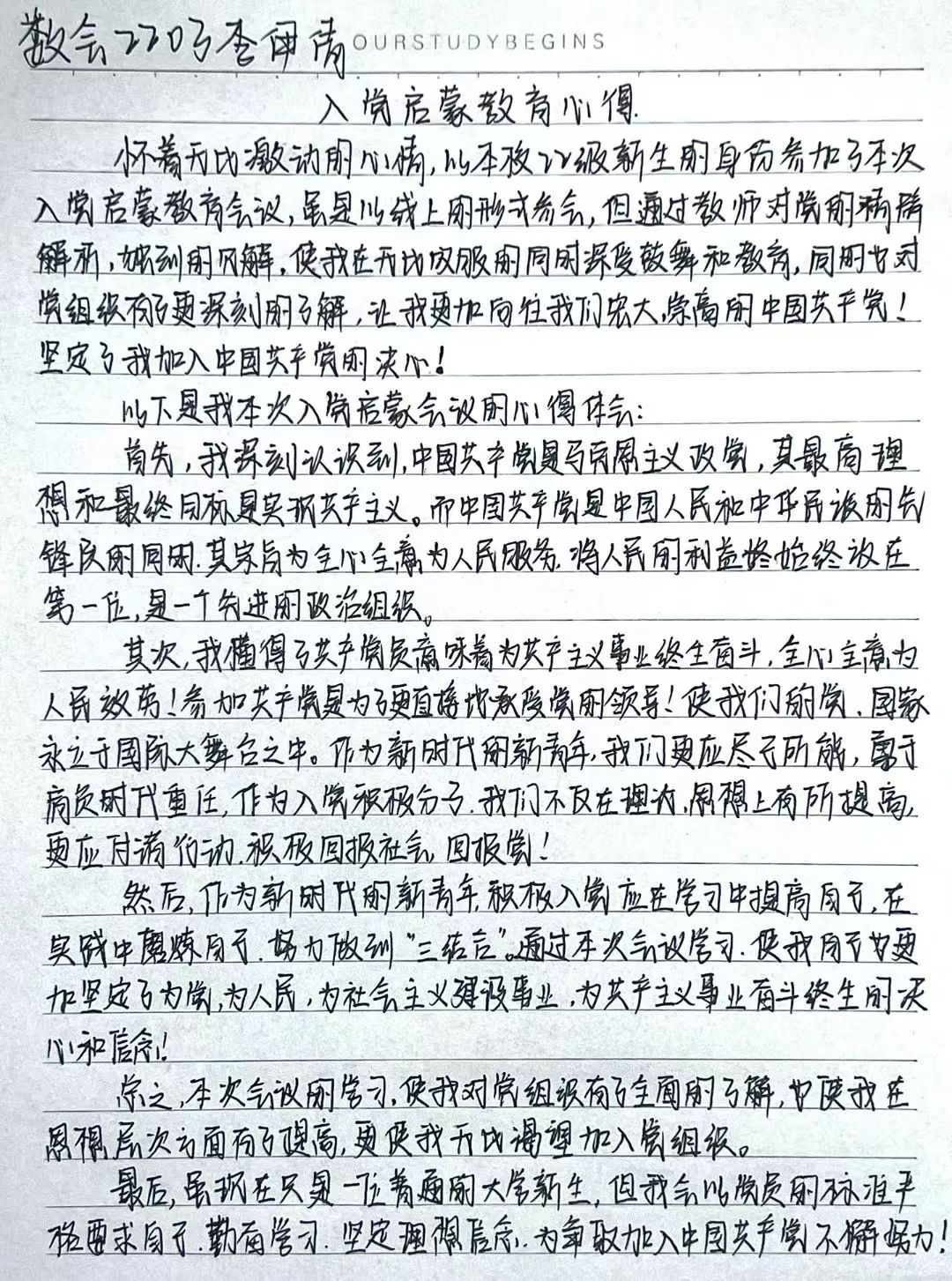 为了让新生了解党的历史,深刻了解党的先进性以及入党的程序等各方面的知识,从而培养同学们艰苦奋斗、无私奉献、拼搏进取的精神品质。会计学院召开2022新生入党启蒙教育培训,新生通过老师授课及观影,课后进行自主学习并结合实际写心得体会。