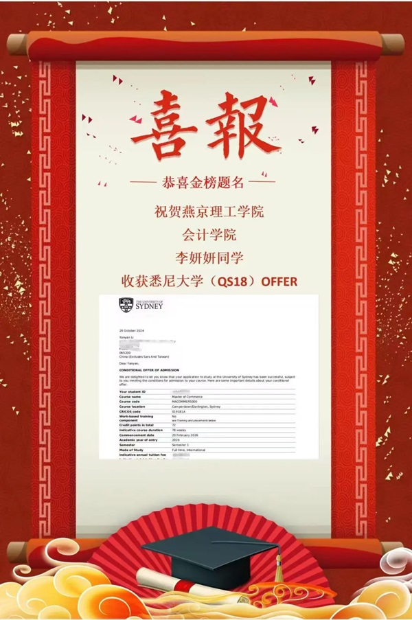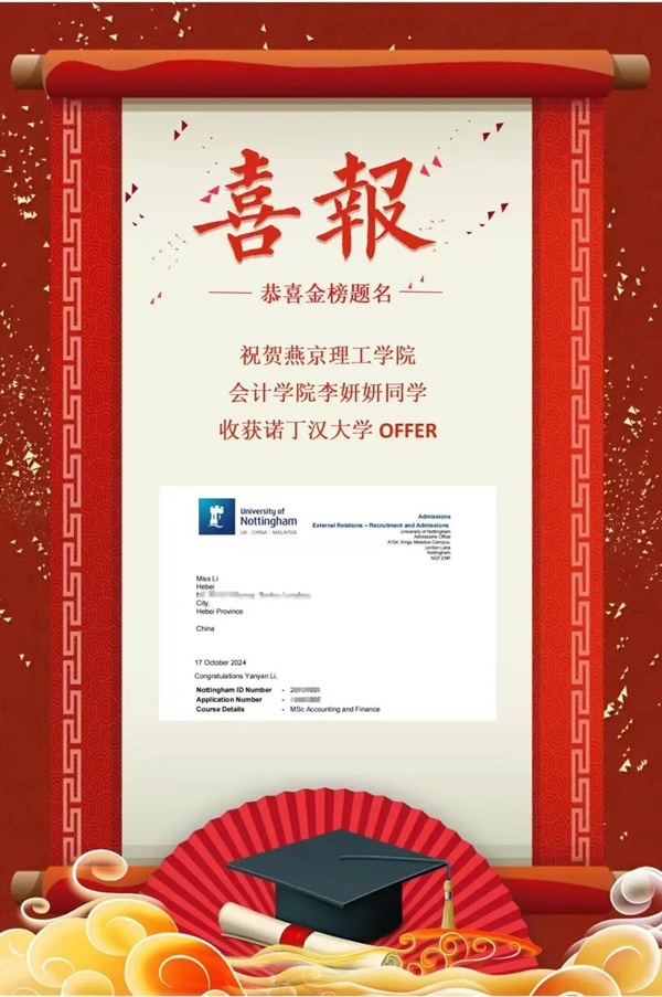 李妍妍成功获得了英国诺丁汉大学和悉尼大学录取通知。面对各种各样的考试都投入全部精力,面对挑战一次次鼓起勇气去面对,面对瓶颈一次次突破,去努力争取每一个能让自己变得好的机会。