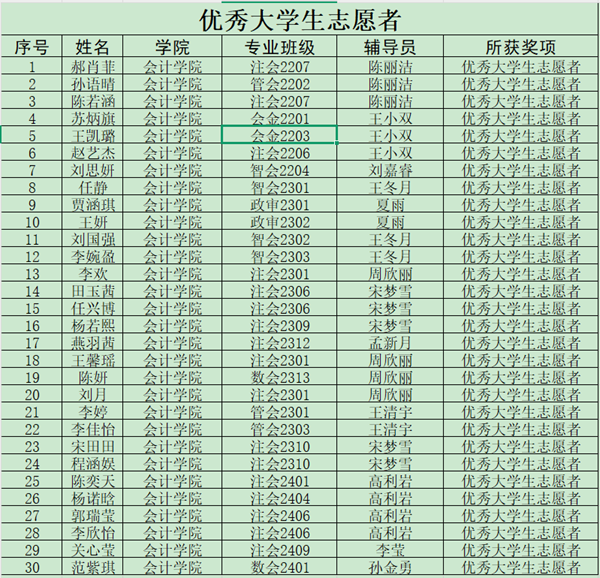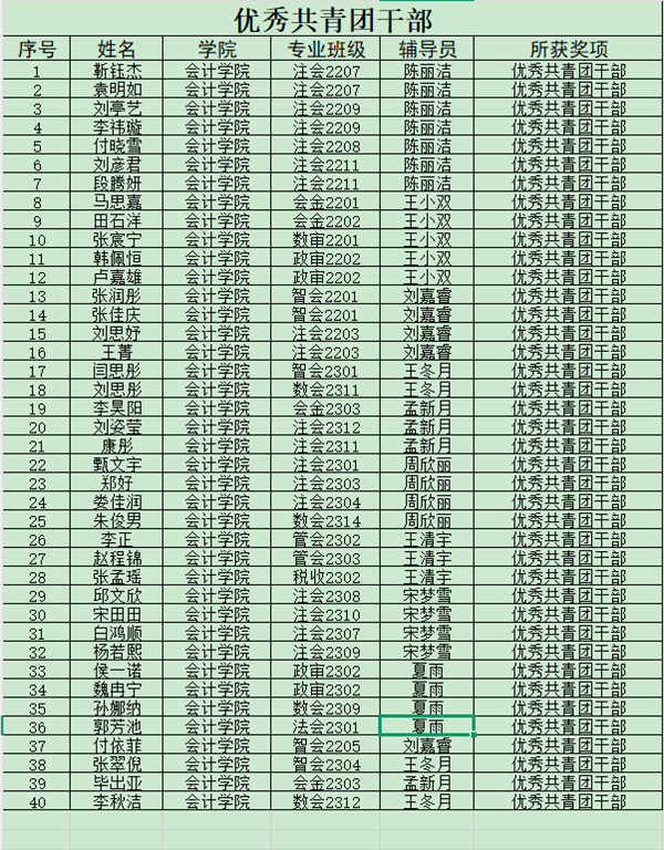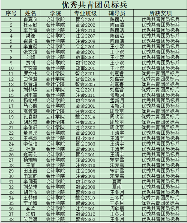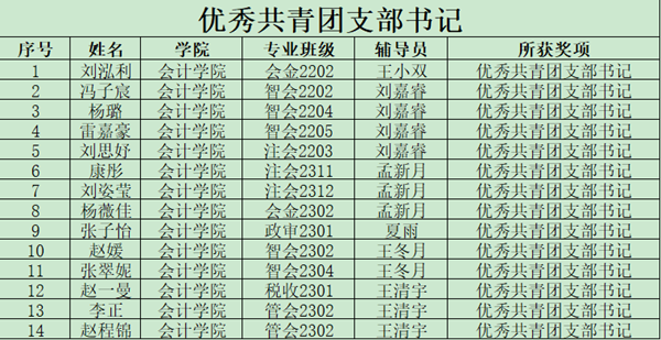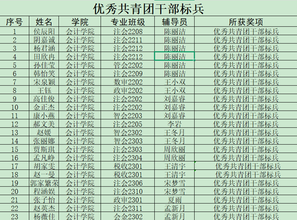 经学生个人申请、班级推荐、学院初审,拟推荐何炫晔等86人为优秀共青团员,王祎然等38人为优秀共青团员标兵,袁明如等40人为优秀共青团干部,郝文美等23人为优秀共青团干部标兵,关心莹等30人为优秀大学生志愿者,张子怡等14人为优秀共青团支部书记,智会2304等8个班级为优秀团支部,管会2202、注会2304为五·四红旗团支部,会计学院团总支和会计学院学生会为优秀学生组织。