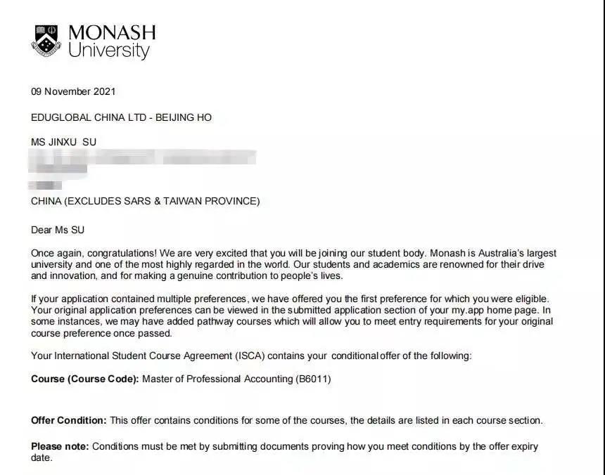 莫纳什大学(2021QS排名58offer