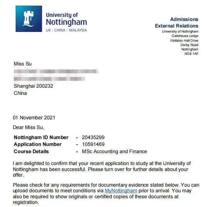 诺丁汉大学(2021QS排名103offer