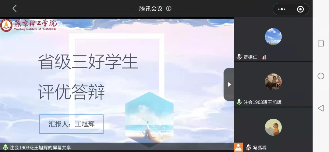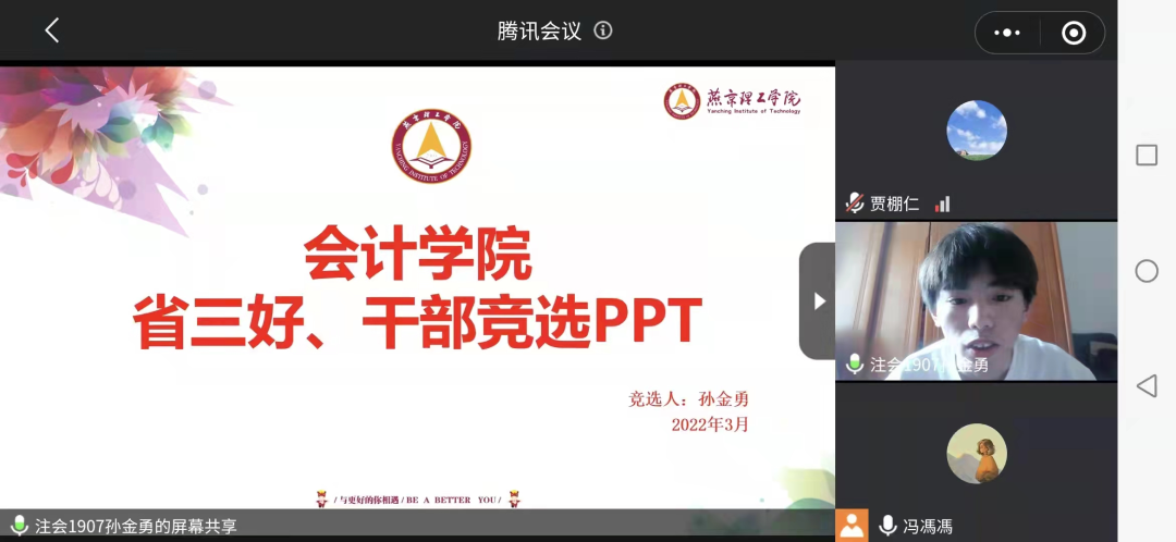 根据河北省教育厅《关于推荐评选2021-2022学年度河北省三好学生、优秀学生干部和优秀班集体工作的通知》和燕京理工学院《关于推荐评选2021-2022学年度河北省三好学生、优秀学生干部和先进班集体工作的通知》的文件精神。3月21日下午,燕京理工学院会计学院开展线上会议进行2021-2022年省级优秀干部、三好学生和优秀班集体的评选会。会计学院副院长兼党总支书记胡国超、学工处高亚丹以及19级-21级辅导员代表参加了本次评选活动。本次会议由冯云珠老师主持。