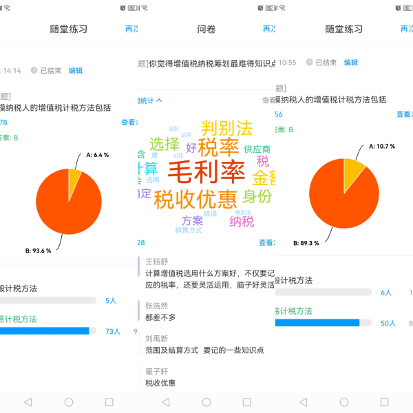 第三,充分利用教学平台功能进行学生学习状态和学习效果的检查,有针对性的进行辅导。通过随堂练习的发放可以及时看到学生的学习效果,可以有针对性的进行学生辅导,同时能够检查学生是否进行在线学习;通过问卷发放,进行学生学习针对知识点的掌握情况进行调研,根据学生的学习情况调整后续的授课内容和进度,针对大部分有问题的知识点进行加强;通过主题讨论发放开放性的问题,激发学生的讨论积极性,从而业务不断的强化专业能力。