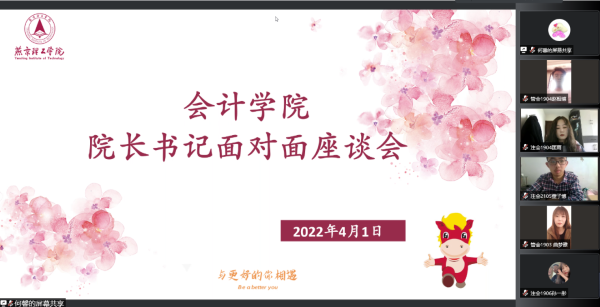 2022年4月1日下午,会计学院在腾讯会议上召开了“院长书记面对面”学生座谈会。会计学院院长杨良教授、党总支书记胡国超、副院长史益芳、辅导员冯云珠以及我院学生代表及学生家长代表共同参加此次座谈会。会议由冯云珠老师主持。