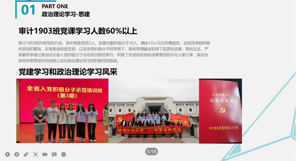 审计1903班是一个积极主动的奋进集体,有着劲而浓厚的学习氛围和坚强有力的领导核心。并且该班提出“班级是我家,建设靠大家”的观念为形成团结协作,拼搏进取的团队精神。在班委会和团支部,以及党员积极分子的带领下,班级思想建设取得了实质性进展,推动全班同学思想进步的加快以及对政治理论学习的积极性的提高。这是一个蓬勃向上的班集体, 在学校“勤奋创新,璞玉成器”校训的熏陶下,班级也将更加“自信、自强、自律、自励”团结互助,携手共进。