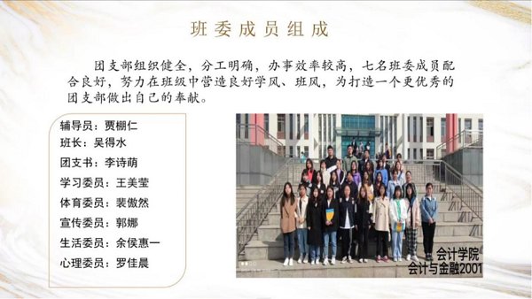 会计与金融2001班拥有良好的作风 是一个有凝聚力的团支部,团支部分工明确,在2021-2022年间获得了五四优秀团支部等诸多班级荣誉奖项,深刻反省不足和缺点并加以改进,班干部并秉持不忘初心、牢记使命、换位思考、真诚待人的原则。班级斗志昂扬,毫不倦怠,相信只要团结向前不甘落后,定能创造更广大的未来。