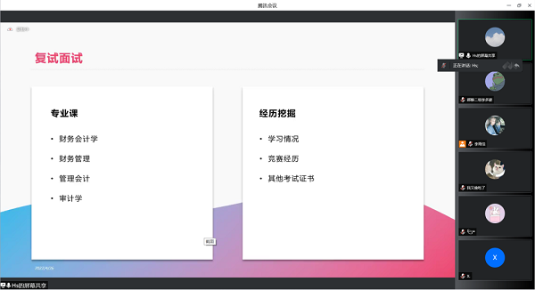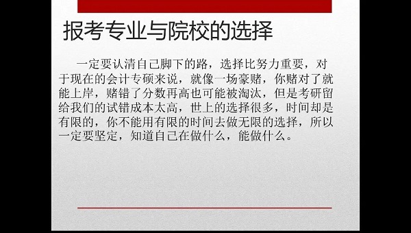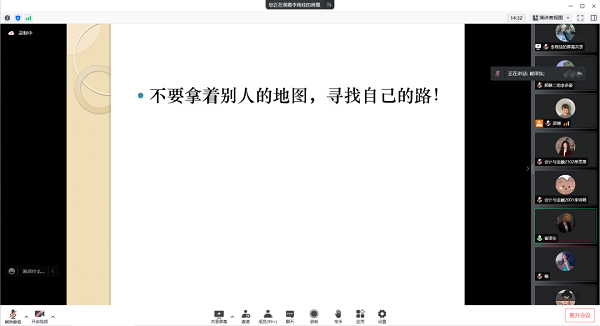 既然选择远方,哪怕风雨兼程,亦会一往无前。考研如同攀登一座高耸入云的山峰,纵使你蹒跚前行,但总会有登上山顶的那一刻,体会到高山之巅浩瀚如烟的云海,回首望来路,消散的是阴霾,留下的是荣耀。考研路上,你我一路前行。4月26日会计学院优秀考研学子在腾讯会议分享了自己的考研经验。