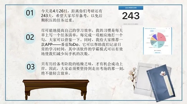 自己选择的路,跪着也要走下去。注会1809的吕航玲学姐以优异的成绩被昆明理工大学拟录取。学姐分别从数学、逻辑、写作、英语方面分享了考研的经验,并对每一学科给出了关键性建议:APP、指导授课老师、学习方法等。学姐还指更要合理安排时间,对自己的时间进行合理规划,做到循序渐进、事半功倍。针对备考建议,学姐提出要提高个人的学习效率,针对自己的实际情况制定任务清单,达到一加一大于二的效果,严于律己,不负韶华。