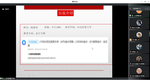 审计1801的陆静诗学姐以优异的成绩被河北经贸大学拟录取。“认清脚下的路,选择正确的方向。”陆学姐针对报考的专业与院校进行了详细的分析,提倡进行自我情绪的调节,扫除焦虑,平静应考。同时,学姐针对各个学科进行了经验分享,在数学、逻辑、英语方面提出可以借鉴一些公众号或者做一些真题模拟进行演练,选中重点,找到突破的方向。漫漫征途,愈挫愈勇,乘风破竹,鹤唳九霄。
