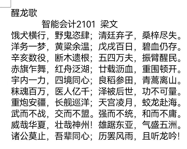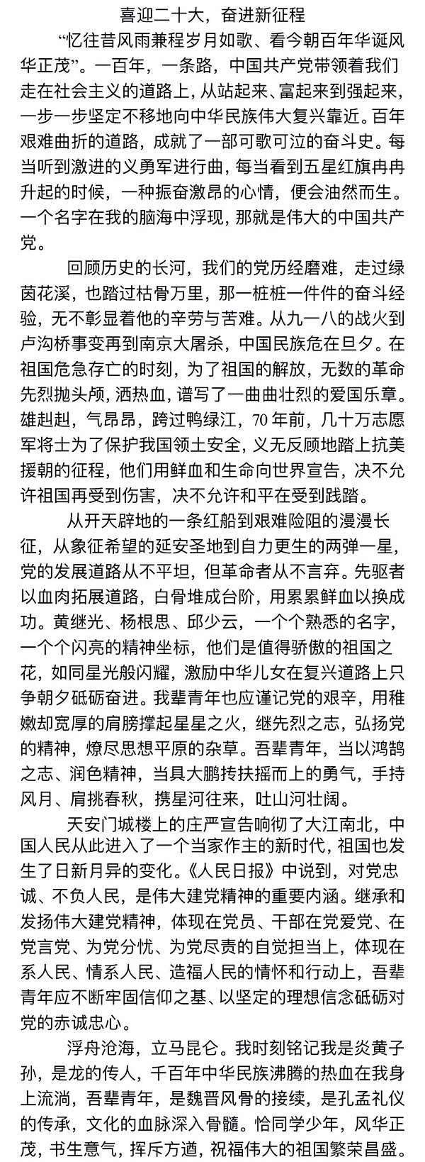 本次征文比赛圆满成功,增强了会计学子的爱国意识,激发了学生们的爱国情感。百年党史,既是固根涵源的营养液、揽镜自照的清醒剂,更是鉴往知来的航标灯。作为新一代的青年大学生,我们要为实现中华民族伟大复兴的中国梦而努力奋斗。立足新征程新使命,走好新一代的长征路。
