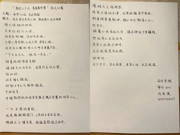 礼赞建党百年,凝聚奋进力量。用青春唱响“强国复兴有我”的时代强音,积极营造喜迎党的二十大的浓厚氛围,会计学院“喜迎二十大,青春著华章”征文比赛经过征集、整理和评审,圆满落下帷幕。