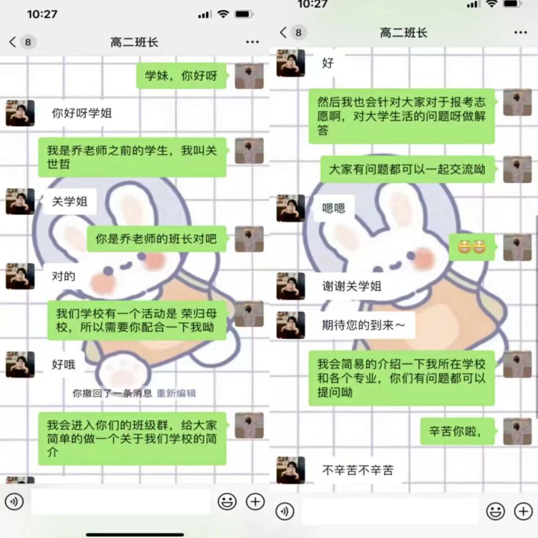 转眼间我已经从我的高中母校毕业四年了,如今我马上也要大学毕业。今天在我的高中老师的帮助下,我和今年要高考的学弟学妹们通过视频的方式在线上进行了交流。首先我介绍了燕京理工学院独特的地理位置,然后对我们学校的环境和各个专业进行了详细的介绍,接着我还介绍了学校举行的各种活动,比如海棠文化节,时尚盛典,各种社团活动和部门活动。最后,我向学弟学妹们分享了一下我的学习方法,并期待他们高考旗开得胜,可以在燕京理工学院与他们相遇。