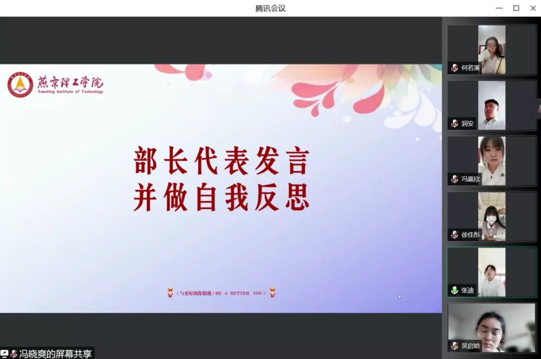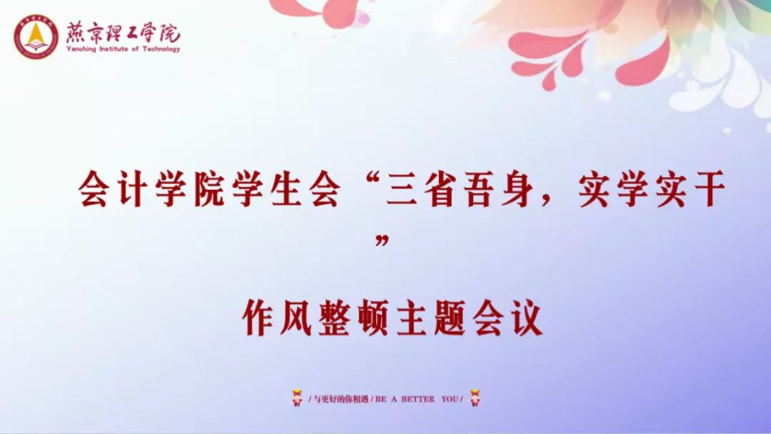 为落实燕京理工学院关于高校学生会组织改革活动,全面加强干部队伍作风建设,推动我校学生会干部为老师、同学担当尽责,健全从严治制度。会计学院学生会于2022年5月15日召开“三省吾身,实干实学”作风整顿主题会议。