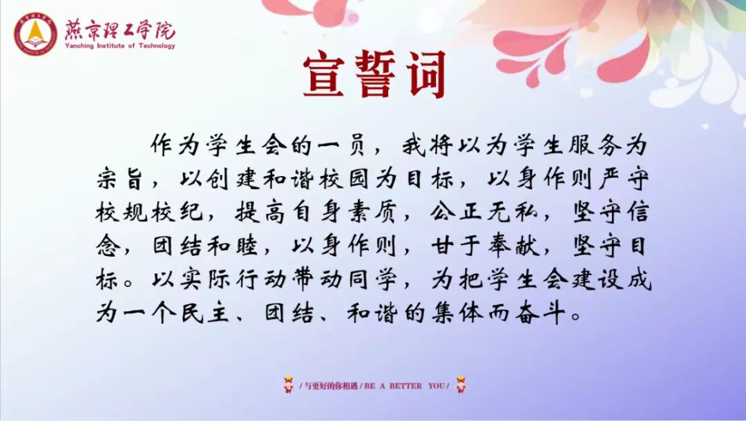 会议伊始,由主持人带领学生干部举起右拳进行庄严宣誓。