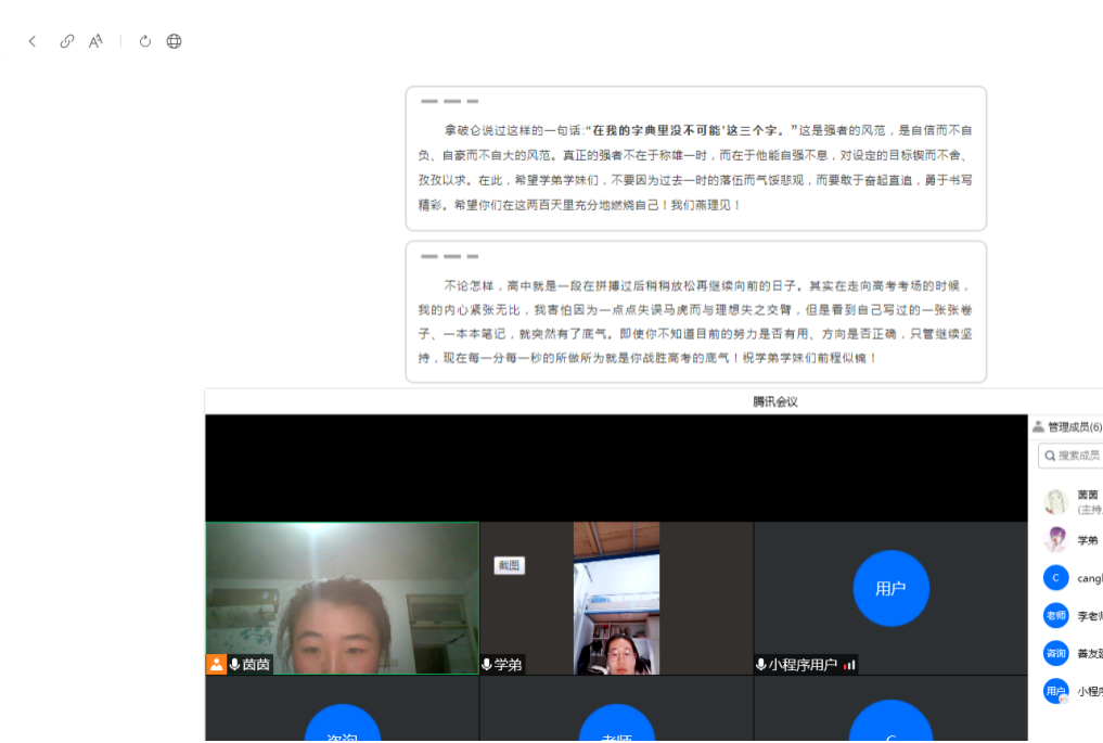 作为一名郑中毕业生,在距离高考最后的二十天里,我以大一学生的身份向母校高三老师交流联系并且向学弟学妹们表达了真挚的祝福。通过此次视频活动,我向老师介绍了大学的多彩生活和学校组织的一系列活动,以及在燕理取得的成就,老师也对我的进步表示非常惊喜,并且期待我在大学中取得更好的进步。视频时我向老师介绍了燕京理工学院的教学质量和环境设施,学弟学妹们通过我和老师的交流也对燕理生活有了更多的期待。除此之外,老师还发了几张班级里学弟学妹们奋斗拼搏埋头苦读的照片,看着他们认真努力的读书,我借老师的视频向学弟学妹们表达了真挚的祝福,希望他们能够把握最后的时间,充实自身知识储备,在高考中取得良好成绩。