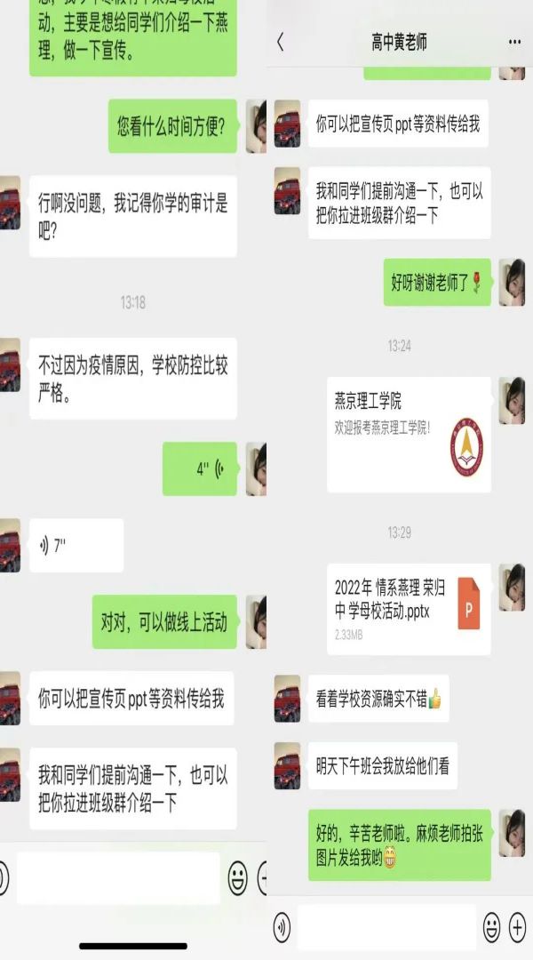 由于疫情原因,我决定采取线上通话的形式与老师进行交流。我对老师进行了亲切的问候,也问起了学校的现状,老师也提及了在学校的趣事。除此之外,我也向老师介绍了我所在的学校——燕京理工学院。学校设有9个二级学院,开设63个本科专业以及29个专科专业,涵盖工学、管理学、艺术学、文学、经济学、理学、法学、医学、教育学9个学科门类。学校先后获“河北省园林式单位”、“河北省示范性就业指导中心”、“河北省优秀民办学校”、“河北省大学生创业孵化示范园”等荣誉称号。老师也向我表示会向学弟学妹们宣传我们学校,鼓励学弟学妹,争取可以在燕京理工相遇。