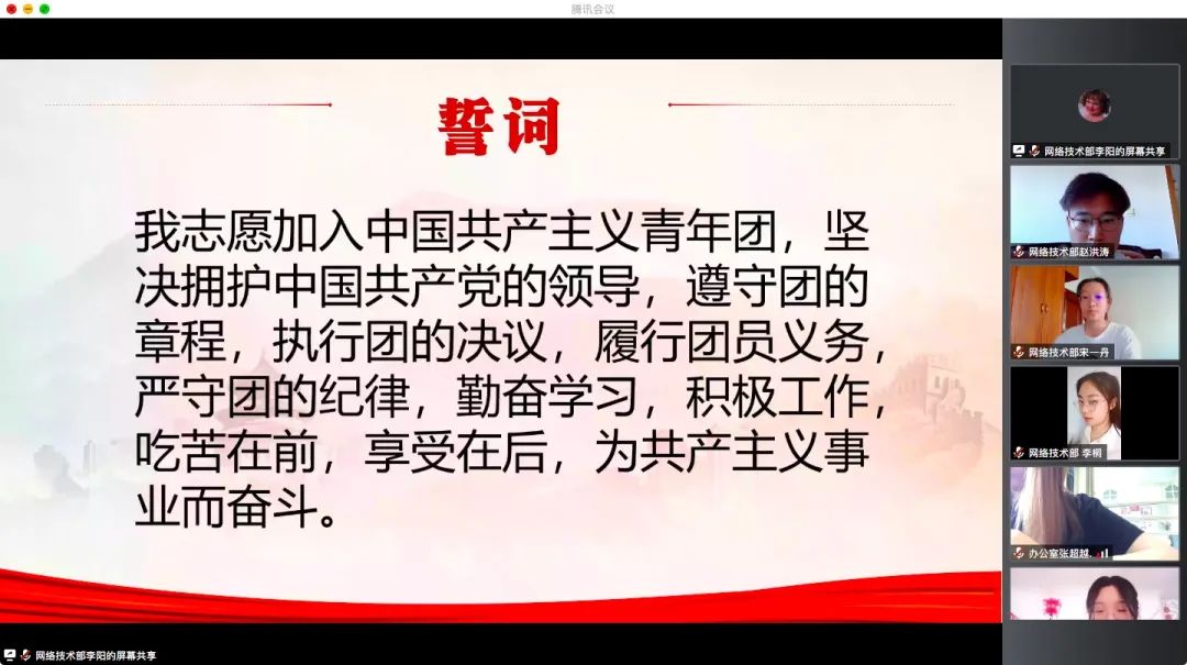 最后进行誓词重温,由新发展团员张佳乐领誓。铿锵有力的宣言,展现了当代大学生的青春力量,誓词让我们燃起对中国共青团的追求向往,向党靠拢,坚定决心,让中国共青团因有我们这些充满朝气的共青团员而骄傲喝彩。紧紧跟随党的步伐,弘扬五四爱国主义精神,续写先辈青春奋斗新篇章。