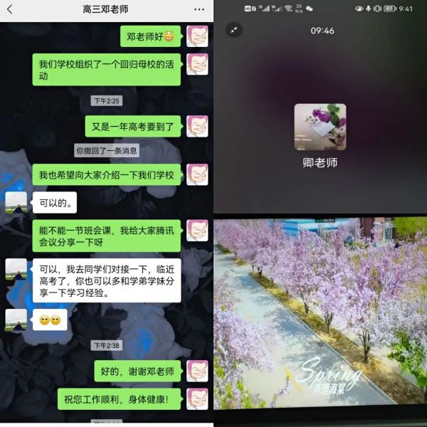 因为疫情原因,只能与高中老师进行线上交流,感谢她高中时的谆谆教诲与帮助,并且和她分享自己大学中的经历,希望能够再次获得老师的宝贵经验。除此之外,我还为学弟学妹们介绍燕京理工学院优越的办学条件、师资力量、海外留学等浓郁的国际化氛围。用公众号的图片为大家展示学校良好的环境与学习氛围,并且分享自己高考时的心路历程,为学弟学妹们指点迷津,帮助他们在高考的道路上越走越远,为他们在今后的选择上提供借鉴。
