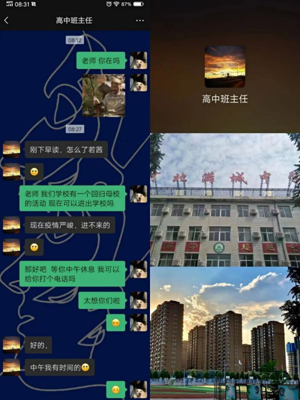由于疫情形势严峻,我采用线上的方式与老师进行了交流。在与老师交流的过程中,我表达了对母校的思念以及对老师的感恩,同时我针对自己在大学期间出现的问题向老师进行请教,老师耐心的解答并帮助我排忧解难。我详细地向老师介绍了我的大学燕京理工学院,学校环境优美,师资力量强大,拥有双一流的专业。最后向学弟学妹们谈了自己高中时的学习体会,分享了我的学习方法,给他们提出建议,帮他们解答疑惑,增强他们的信心。希望他们高考顺利,取得自己满意的成绩,期待与学弟学妹们在燕理相遇!