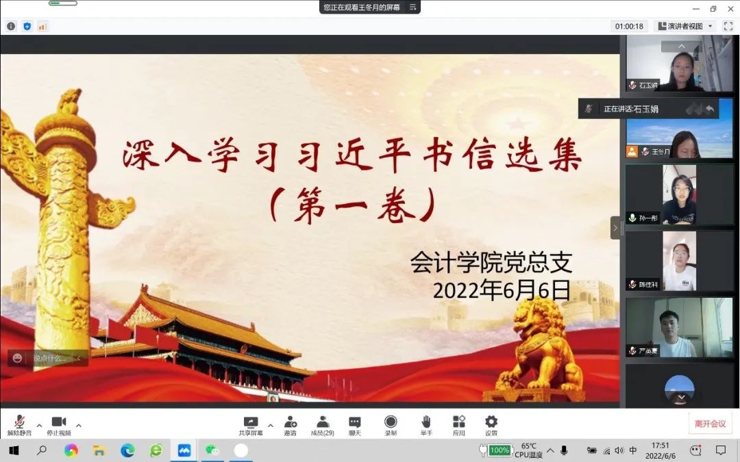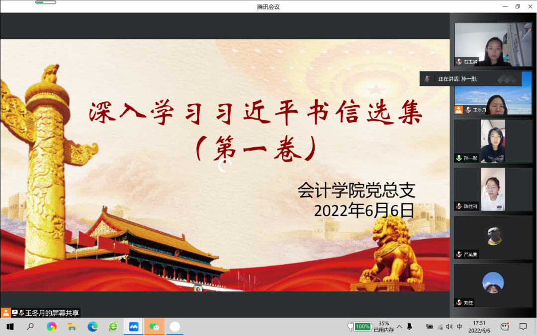 会计学院党务助理团指导老师王冬月强调,我们要认真学习宣传贯彻《习近平书信选集》第一卷,要结合实际,反思自己、充实自己、提升自己。作为新时代的青年大学生,应牢记党的宗旨,认真学习贯彻习近平总书记重要讲话精神,坚定不移跟党走,为实现党在新时代的历史使命、夺取中国特色社会主义新胜利而不懈努力!