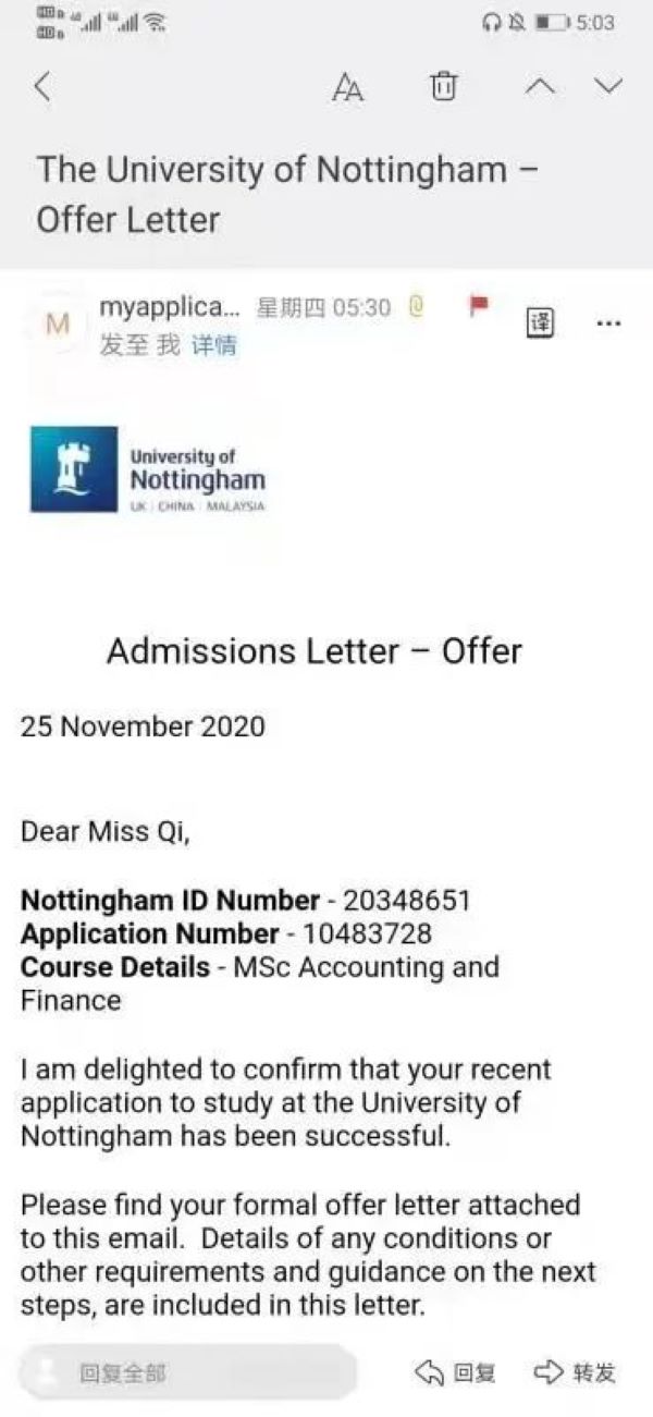 2020年11月,会计学院会计1716班亓欣收到诺丁汉大学会计与金融专业预录取offer。是学校的本硕直通项目,让她成功牵手了世界名校。亓欣讲到她取得这样的成绩离不开学校提供的本硕直通这个平台提供的海外学习资源,也离不开院长和各位辅导员老师的支持鼓励。正是学校制定的专项学习计划,才使她更加合理利用大学自主学习时间,同时对自己的职业和学习生涯有了明确的规划。她根据学校的专项计划,同时遵循记忆曲线规律定期复习巩固知识点,最终与名校相遇。