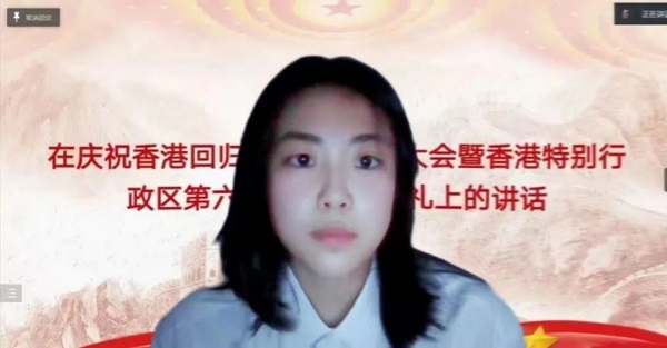 学生会成员刘佳同学宣讲《在庆祝香港回归祖国25周年大会暨香港特别行政区第六届政府就职典礼上的讲话》。主要传达了中华民族伟大复兴已经进入不可逆转的历史进程。推进“一国两制”在香港的成功实践是这一历史进程的重要组成部分。我们要坚信,有伟大祖国的坚定支持, 有“一国两制”方针的坚实保障,在实现我国第二个百年奋斗目标的新征程上,香港一定能够创造更大辉煌,一定能够同祖国人民一道共享中华民族伟大复兴的荣光。