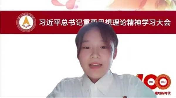 学生会成员符祎璠同学以《习近平总书记在中国人民大学考察调研》为主要内容,介绍了关于《习近平在中国人民大学考察时强调坚持党的领导传承红色基因扎根中国大地走出一条建设中国特色世界一流大学新路》,符祎璠同学提出,广大青年努力用脚步丈量祖国大地,用眼睛发现中国精神,用耳朵倾听人民呼声,用内心感应时代脉搏,把对祖国血浓于水、与人民同呼吸共命运的情感贯穿学业全过程、融汇在事业追求中。