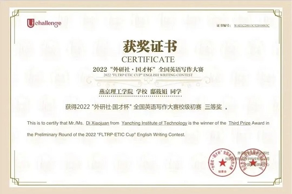 树立了目标之后,想要完成华丽转身,离不开自身的努力。邸筱娟进入燕京理工学院以来,刻苦学习,寻求进步,汲取知识。在这短短几个月里,她参加了2022“外研社·国才杯”全国写作大赛、“用英语讲好中国故事”短视频比赛等多项竞赛并取得了优异的成绩。
