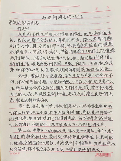 新兵入伍离开校园,老兵退伍再当学生,正是一代代的传承与发展让燕理注入了越来越多的优良精神与风气,也让燕理有了无限的可能。退伍老兵们说,信是燕理退伍老兵对新兵同志们的期望与嘱托的载体,同时也希望更多燕理学子能像这十名同志一样奋发有为,在毕业后,响应国家号召,积极应征入伍,献身国防,为我国国防奉献出自己的力量!