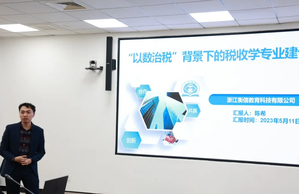 浙江衡信教育科技有限公司市场总监陈希发表了主题为《“以数治税”税收学专业建设》的讲座。深入分析我国数智时代快速发展与税收专业人才培养的现状和存在问题,并为会计学院税收学专业人才培养提出建设路径。
