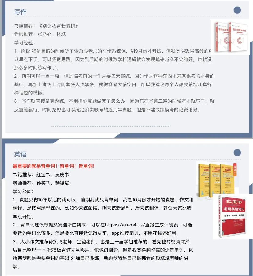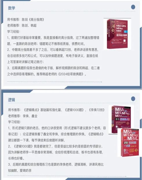 数学部分一定要把基础打好,真题中并没有几道怪题;英语一定要背单词,按照艾宾浩斯曲线一直背到考前,找到阅读的规律;逻辑最好跟着一个老师走,尤其是形式逻辑部分,每个老师的方法都不一样,很容易弄混;论说论效可以在日常积累一些句子,到考前总结出一些通用话术。可以使用番茄todo APP记录学习,学累的时候听听歌,尽量不要选择刷视频,因为视频的时间比较短,而一节视频课的时间比较长,思维会不容易转换过来。