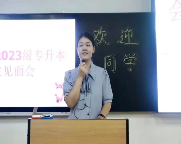 随后由2023级专升本新生辅导员徐秋梦老师进行发言。徐老师进行自我介绍后,就学习与保持身体健康两方面举行了一场主题班会。在学习方面,徐老师就会计学院的就业政策、考公形势、海外深造等项目为大家做出简单介绍,建议同学们明确人生目标,提前做好准备。在健康方面,徐老师建议大家在大学里规律锻炼,保持身心健康。