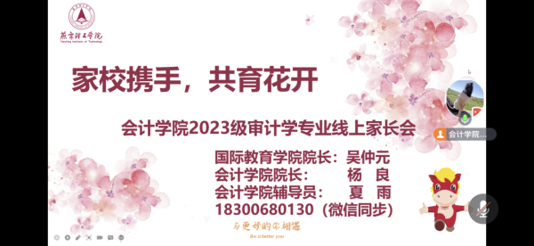 为了进一步促进家校联动,加强家校之间的沟通交流,提升家校合力,11月9日晚上,燕京理工学院会计学院于线上组织召开2023级审计学专业学生学业规划家长交流会。本次会议由2023级辅导员夏雨老师主持,会计学院院长杨良教授、国际教育学院院长吴仲元及2023级审计学专业学生家长共同参加本次会议。
