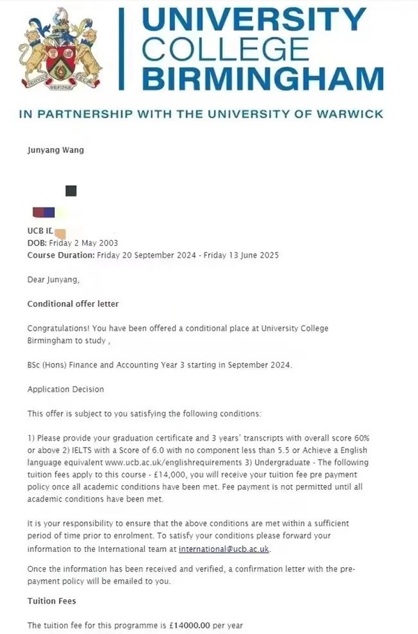 王君洋,2021年考入并就读于燕京理工学院会计学院,并于2024年收到伯明翰大学学院的offer。王君洋同学在大学保持一颗乐观的心态是他取得这一成绩不可缺少的因素,遇到困难不慌张,稳住自己的心态,任何事情都可以迎刃而解。