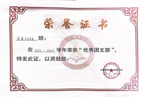 支部成员充分体现个人的积极性和先进性,获得校级奖学金和国家励志奖学金,在各项评优中获得“优秀共青团员”“优秀共青团干部”“优秀共青团员标兵”“校级三好学生”“优秀干事”“优秀社会实践队员”等各项荣誉。在学术竞赛和考试中获得初级会计师证书、普通话证书、全国大学生英语竞赛二等奖、“外研杯”英语阅读大赛三等奖、会计学院歌唱之星第四名和武术比赛“集体拳术”第五名等优异成绩。团支部于2022-2023年获得了“优秀团支部”称号。我们始终相信只有团支部成员更加团结一致,锐意进取,齐心协力,才能勇敢迎接新的挑战!