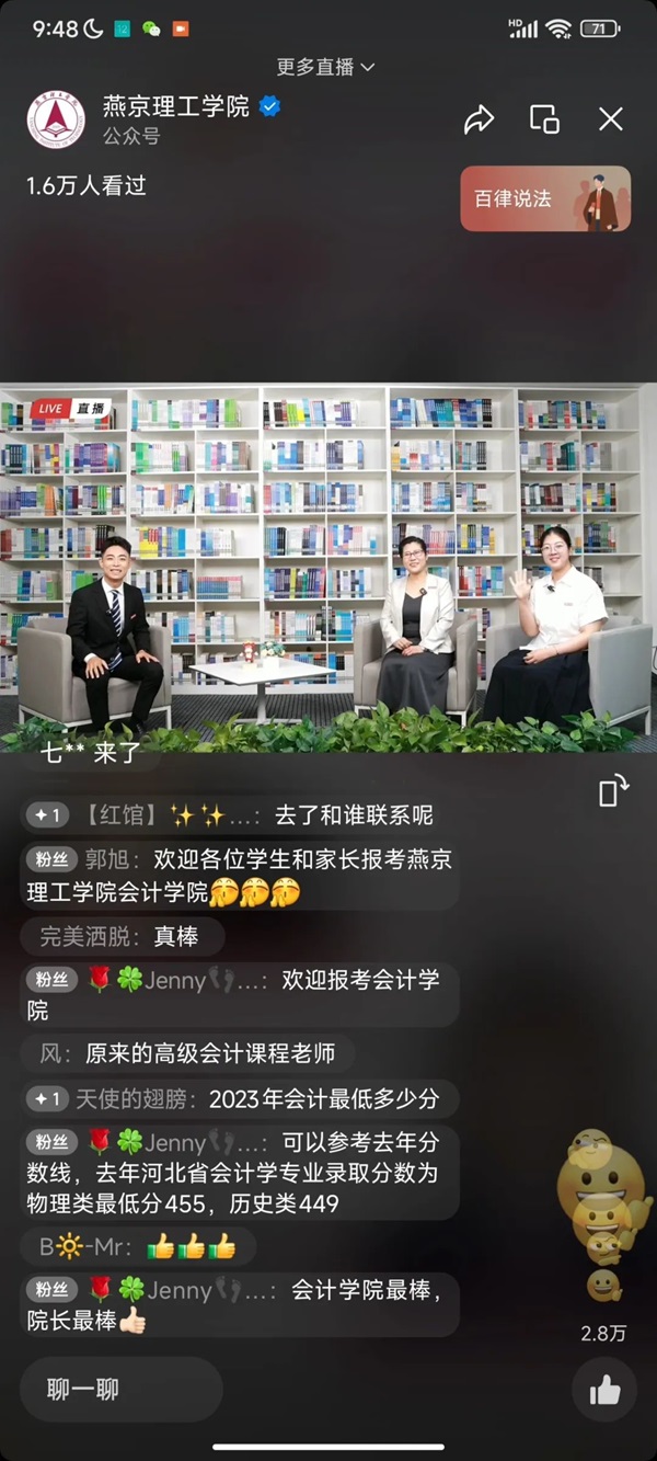 在直播过程中,杨良教授详细解读了燕京理工学院会计学院的发展历程与未来发展方向。她明确表示,学院将始终秉持以学生为中心的教育理念,持续优化教育教学资源,提升教学质量。此外,学院还将加强与企业和行业的合作,为学生提供更多的实践机会和就业渠道。