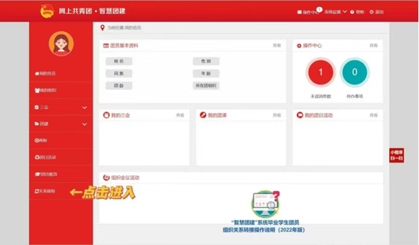 成功登录智慧团建后,进入个人中心,点击关系转接。