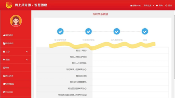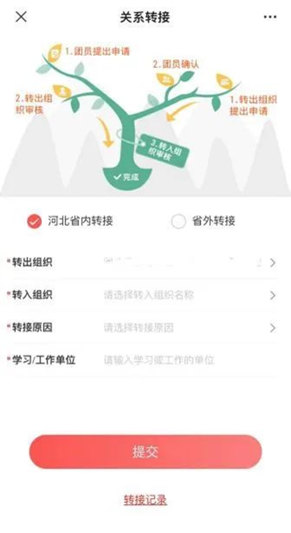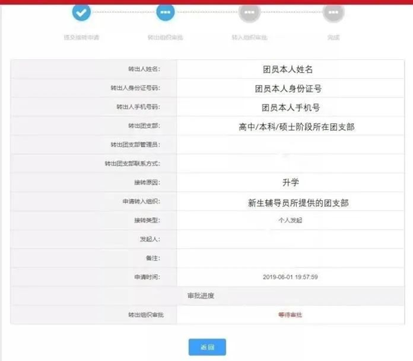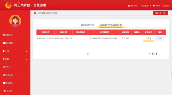 点击「提交」即可等待团组织关系转接的审批,界面如下: