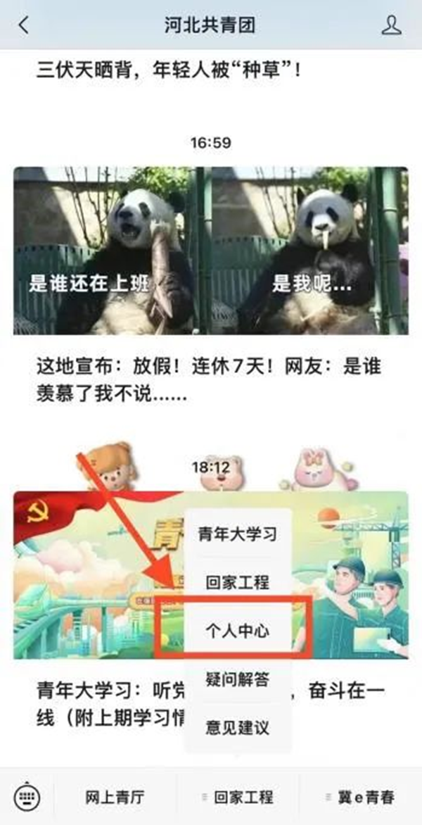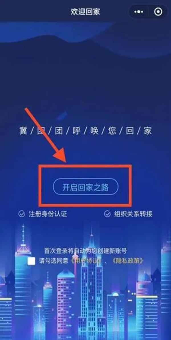 关注微信公众号“河北共青团”,进入“河北共青团”微信公众号,选择“回家工程”“个人中心”,点击回家工程中的个人中心,开启回家之路,输入个人信息进行绑定。