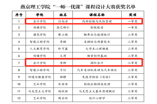 近日,燕京理工学院为提升课程建设品质及青年教师的教学素养与业务技能,成功举办了“一师一优课”课程设计大赛校级赛事。经过一番激烈的竞争,会计学院闫旭召与李烨老师凭借其新颖的教学理念、精湛的教学方法及出色的教学过程,在众多参赛者中脱颖而出,最终闫旭召老师获得一等奖、李烨老师获得三等奖。