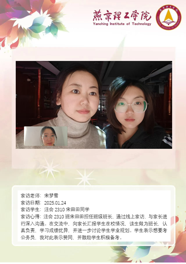家访之路,或长或短,或艰辛或顺畅,但每一次的交流都是一次心灵的触动,每一次的沟通都是一次教育的升华。燕京理工学院的老师们将继续秉持着对教育的初心,在家校共育的道路上坚定前行。相信在家校的紧密合作下,学生们定能如茁壮成长的幼苗,在知识的沃土里汲取养分,在关爱的阳光下绽放光彩,向着美好的未来不断迈进。