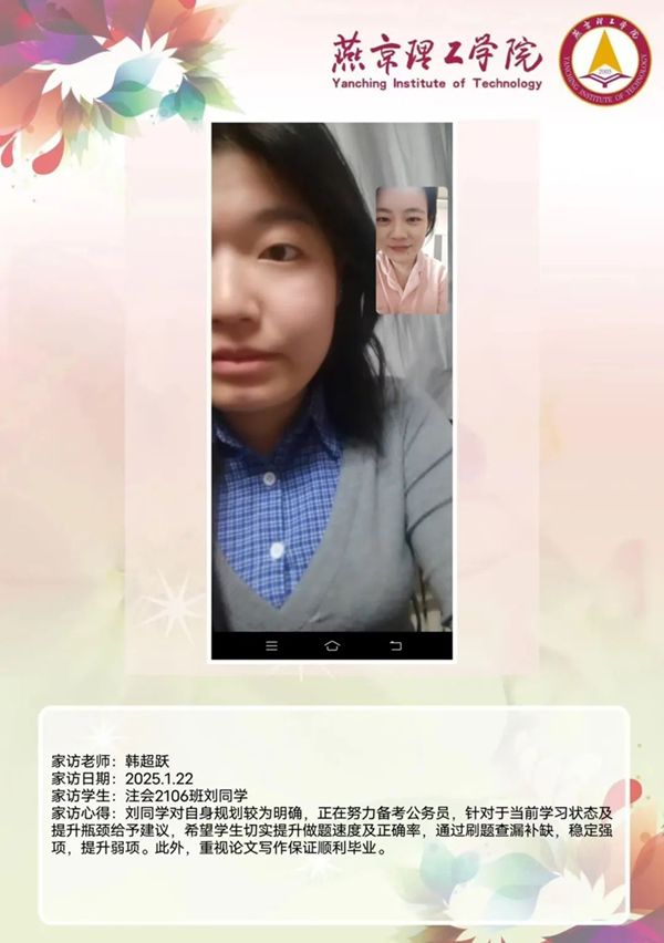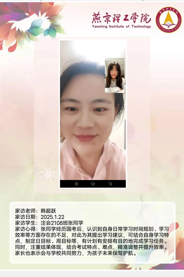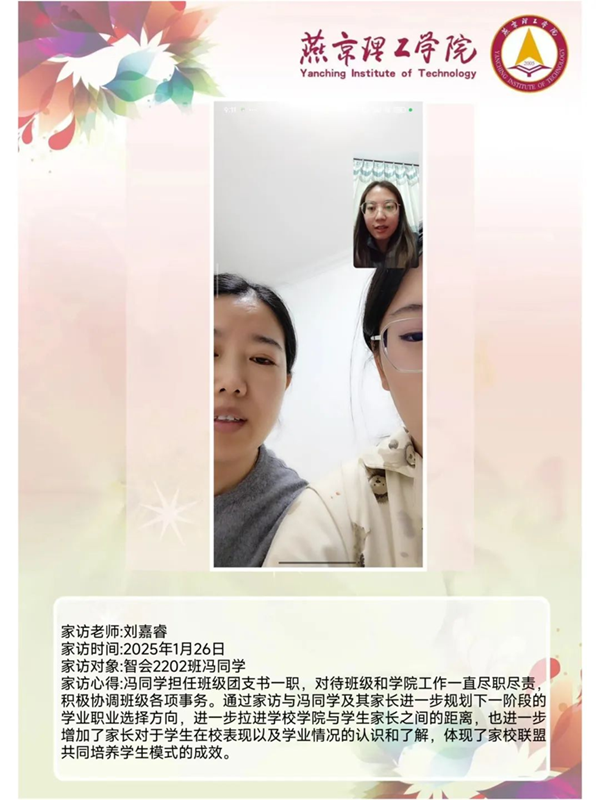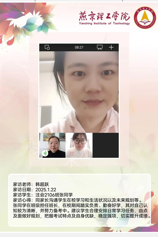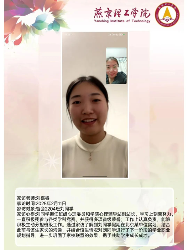 在燕理会计学院这片知识的沃土里,每一位学子都是怀揣梦想的种子,等待着绽放光芒。学院秉持着“学以致用,德才兼备”的教育理念,致力于培养兼具专业素养与综合能力的会计人才。寒假期间,为了让这些种子在成长的道路上获得更充足的养分,老师们开启了一场特殊的旅程——线上家访。通过这小小的屏幕,老师们跨越距离的界限,走进学生的家庭,与家长携手,共同为学生的未来精心耕耘。